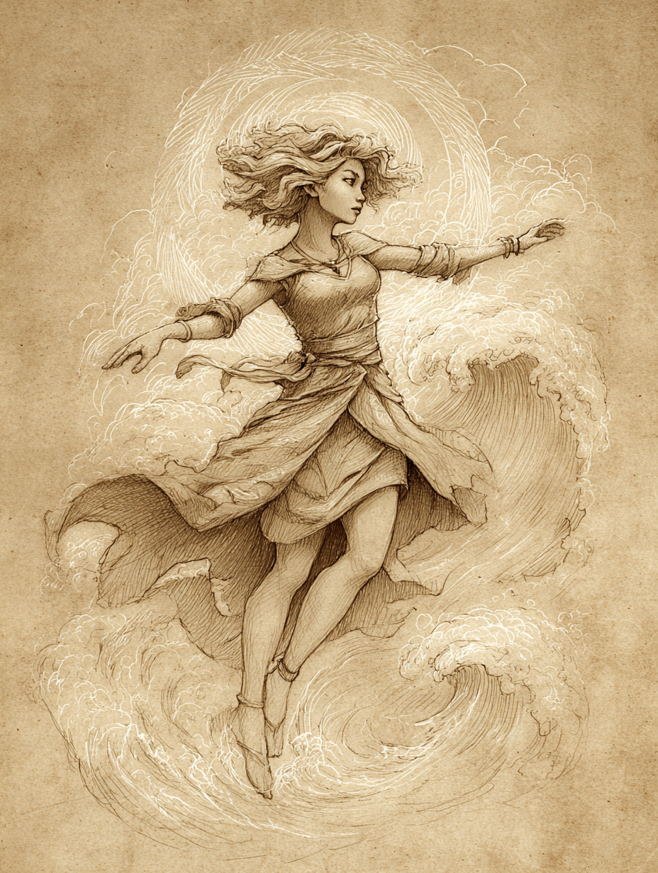 Tarsaralei governs the elements in their most untamed state. The gale that snaps a mast clean through. The wave that lifts a ship like a toy and dashes it against black stone. The storm surge that remakes a coastline in a single night. The sudden summer torrent that turns dry earth green by morning. She gives wind and water their force, but not always their restraint. In old stories, she is often described as powerful enough to devastate a kingdom almost by accident, then stricken with remorse so fierce it sends her fleeing to her brothers in shame and grief. Her nature is neither malicious nor safe. She means no harm, but meaning no harm has never kept a village from flooding.