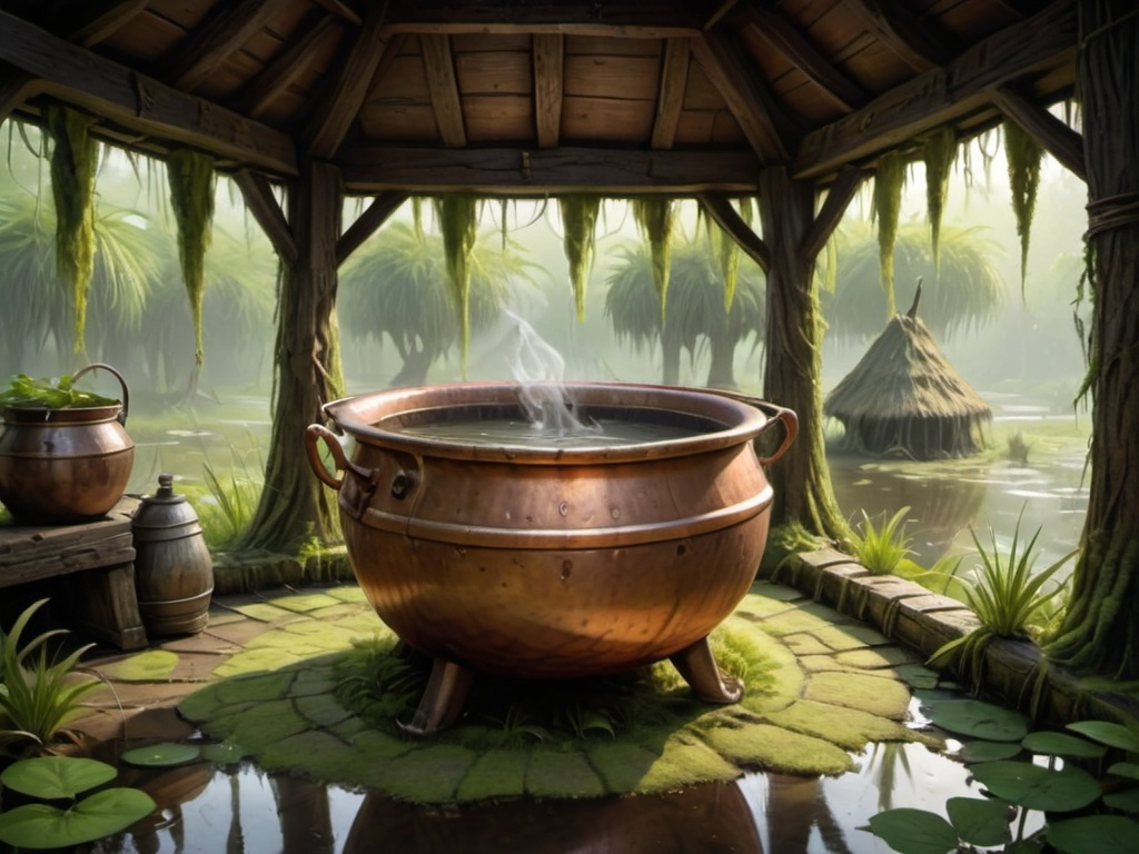 A large copper cauldron used by the swamp hag Bavlorna for brewing potions and creating magic items. It contains a piece of Tasha's Cauldron.