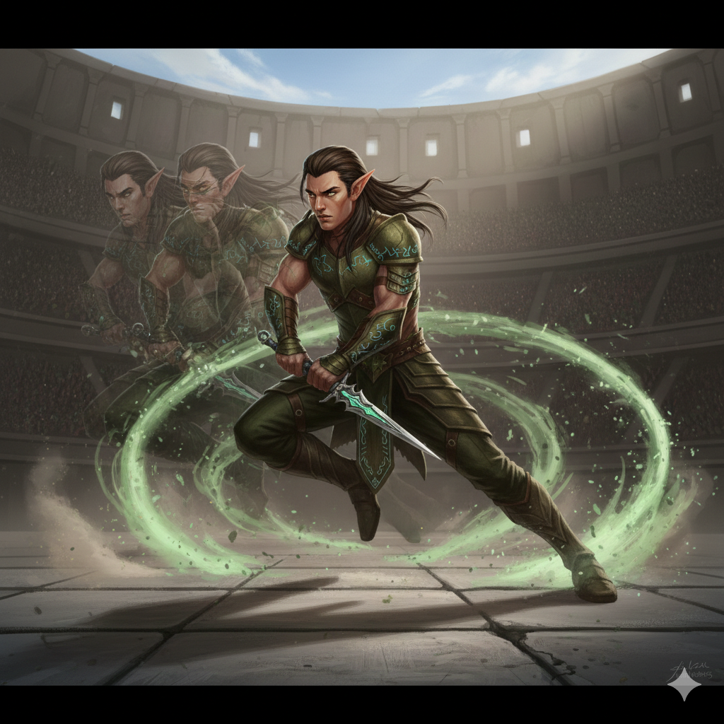 Trükkös, lopakodó woodelf közelharcos, aki kiszámíthatatlan mozdulatokkal támad.