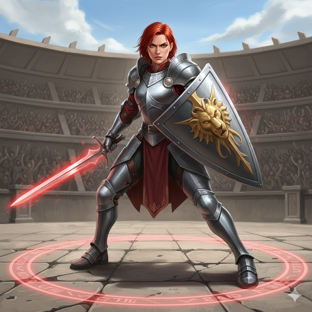 Fegyelmezett emberi harcos, aki pajzzsal és karddal tartja az ellenfelet távol, miközben stabil, megbízható csapásokat mér.