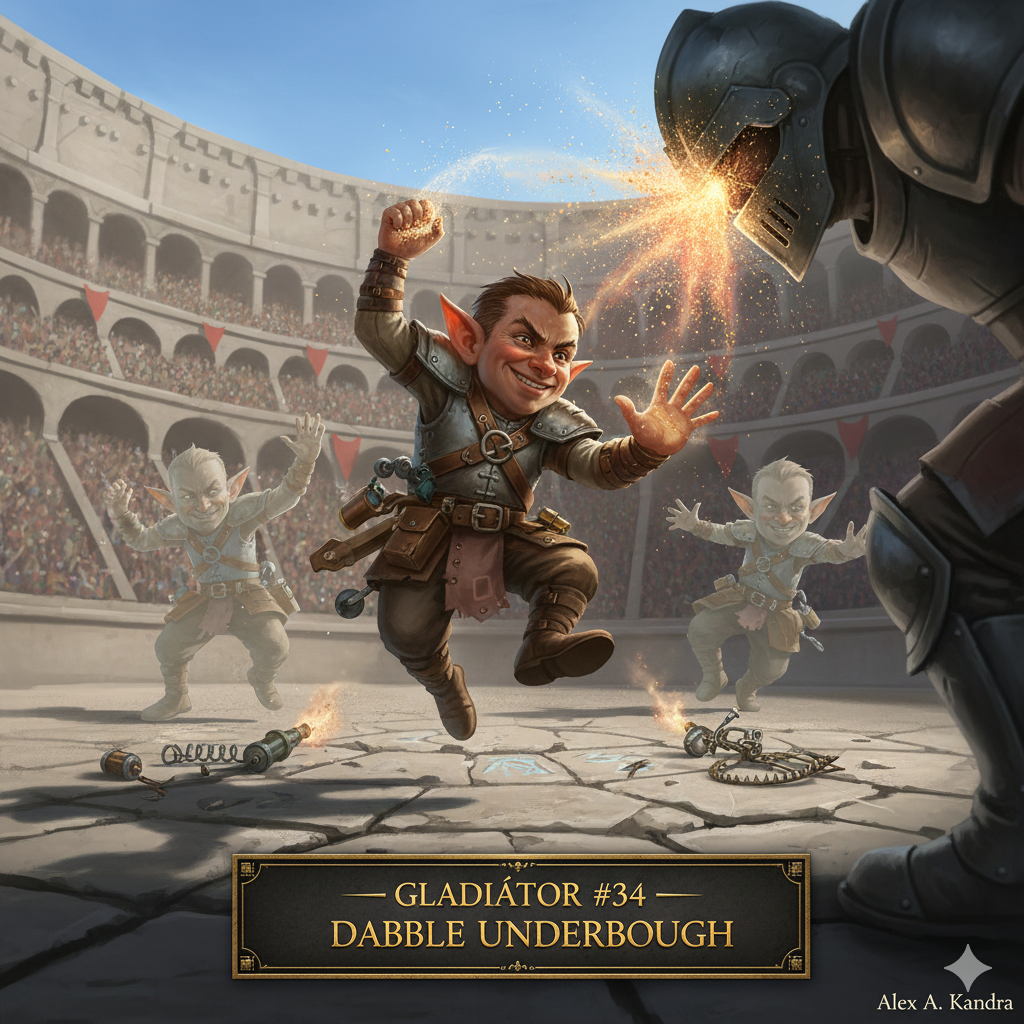 Egy apró, sunyi gnóm, aki puszta kézzel harcol — de nem tisztán. Mindig van nála valami csapda, por, zavaró trükk, amivel kibillenti az ellenfelet az egyensúlyából.