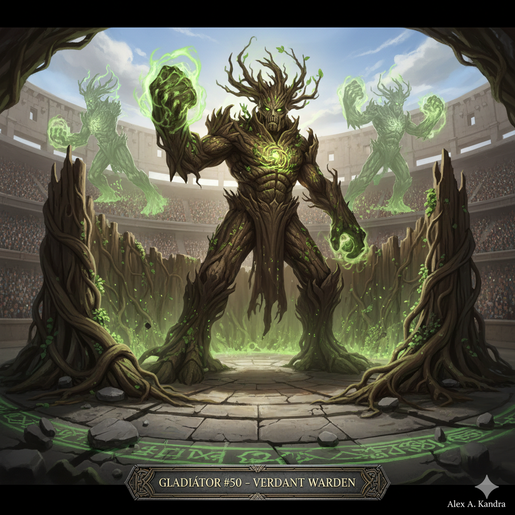Verdant Warden mélyen a talajba döfi a lábát, és a teste körül vastag, élő kéregfalak nőnek ki. A környező föld remeg, és a természet ereje átjárja.