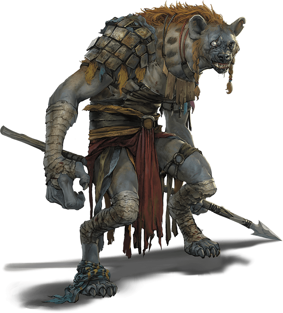 The first gnolls arose from hyenas that fed on flesh tainted by the Abyss. Their corruption and violence delighted the demon lord Yeenoghu, who encouraged their numbers and spread them across the multiverse. Ever since, gnolls have been the cackling servants of Yeenoghu, existing to cause ruin and to feast on what remains.