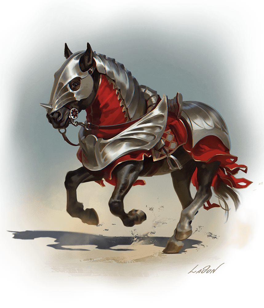 Hooves. Melee Attack Roll: +6 (roll:1d20+6), reach 5 ft. Hit: 9 ( 2d4+4 ) Bludgeoning damage. If the target is a Large or smaller creature and the horse moved 20+ feet straight toward it immediately before the hit, the target takes an extra 5 ( 2d4 ) Bludgeoning damage and has the Prone condition.