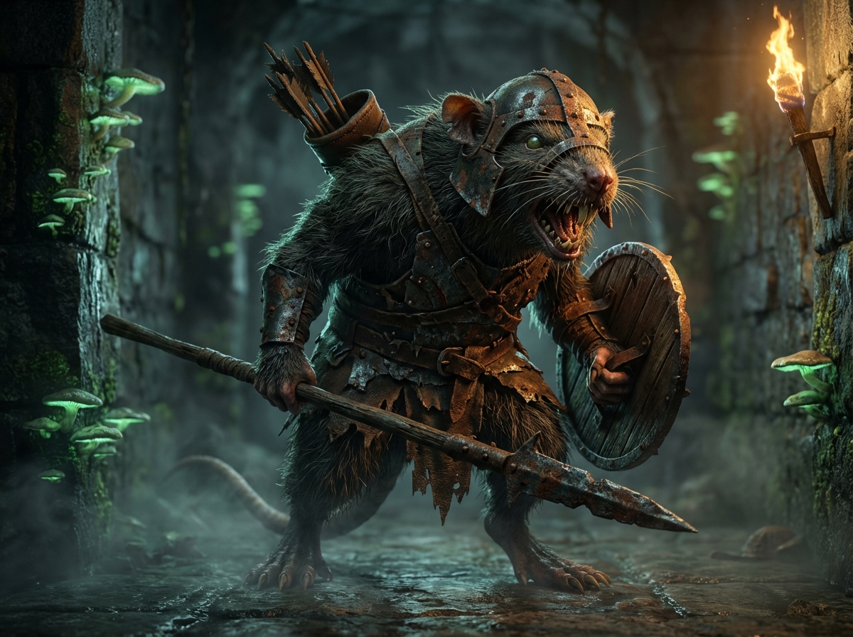 Spear. Melee weapon attack, 5 ft, to hit: 1d20+6 , on hit: 1d6+4 Piercing damage. Shield Bash. As part of the weapon attack the Ratfolk Warrior makes a shield bash, the creature makes a Strength or Dexterity Saving Throw DC14, on failure it gets knocked Prone.