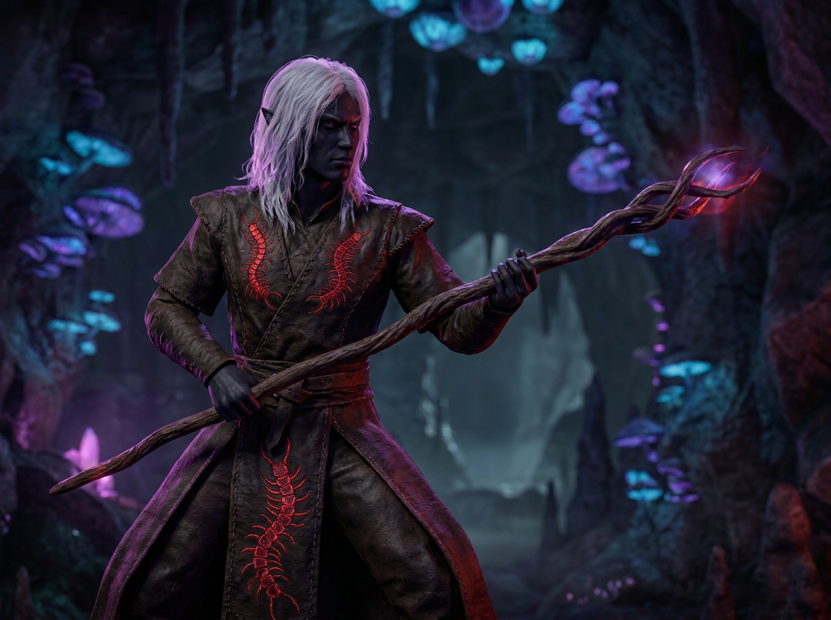 A robed Drow with a quarterstaff.